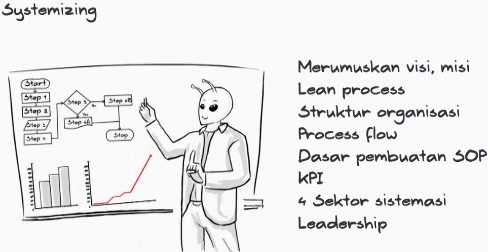 Pada tahap Systemizing ini kita focus mendokumentasikan atau menstandarisasikan perusahaan atau bisnis yang sudah berjalan. Oleh sebab itu jika belum mempunyai usaha dan karyawan, kita belum bisa melakukan Systemizing sebab apanya yang mau didokumentasikan atau distandarkan ?. Sebab jika belum memiliki usaha segalanya kembali kepada kita sendiri.