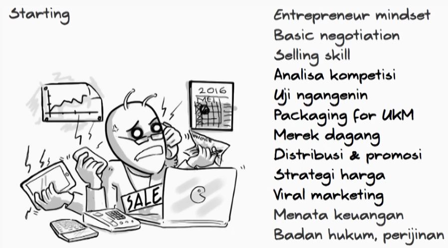 Hal yang perlu dikuasai:Entrepreneur mindset, Basic negotiation, Sellingskill, Analisa kompetisi, Uji ngangenin, Packaging for UKM, Merek dagang, Distribusi & promosi, Strategi harga, Viral marketing, Menata keuanggan, Badan hukum dan perjanjian.